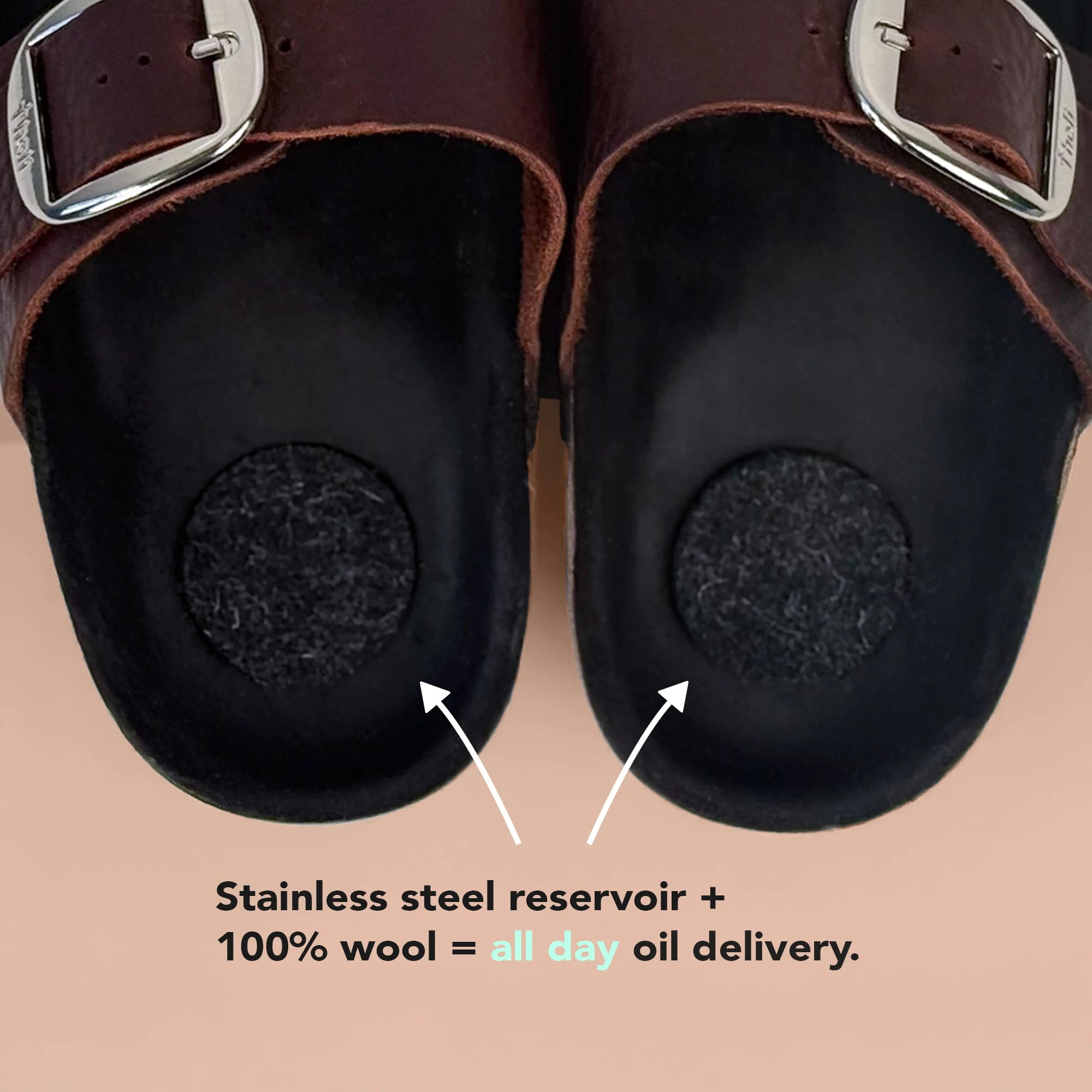 Intentionally engineered oil delivery system to get your favorite oils (we hope ours makes your list!) into your body. This sits perfectly in the sole of the sandal to allow all day oil delivery while maintaining premium comfort.