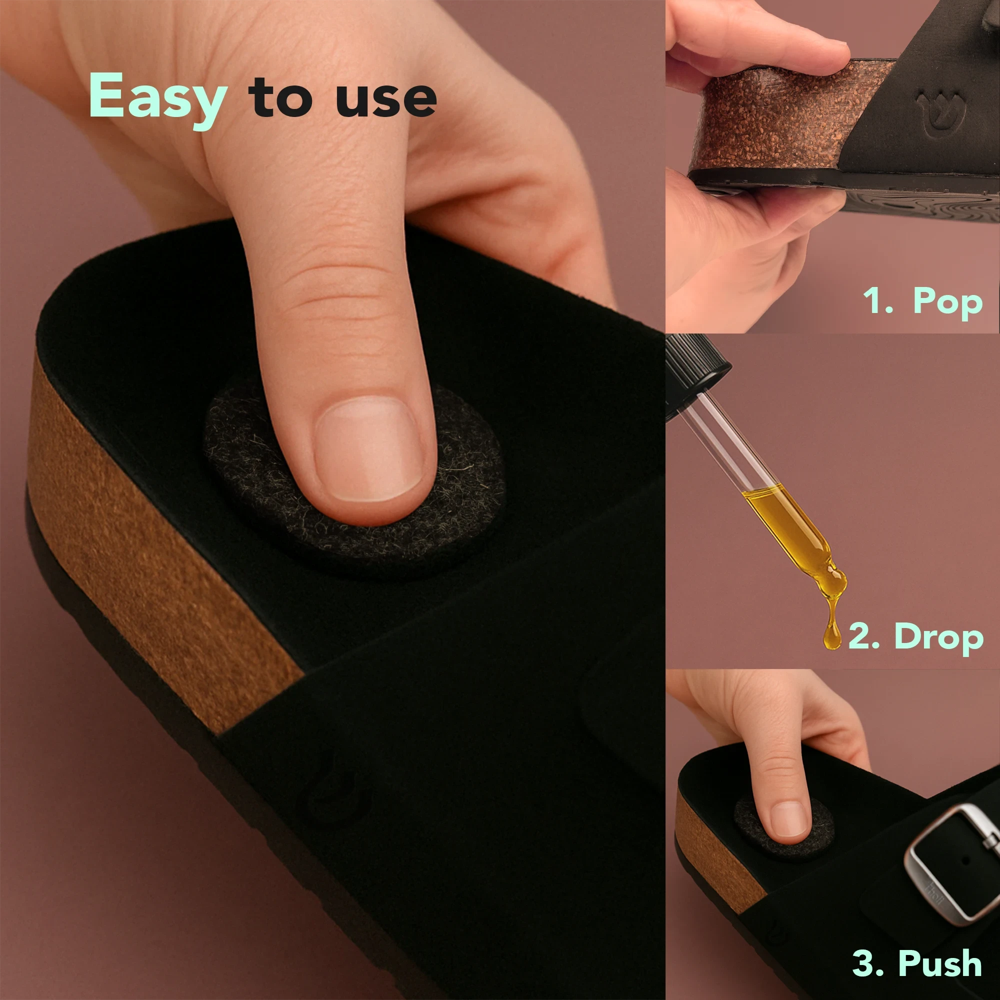 - The essential oil cartridge sits down inside a cavity with only a small, metered amount of essential oil coming up onto the wool disc and then onto the bottom of the heel to be absorbed into the body.