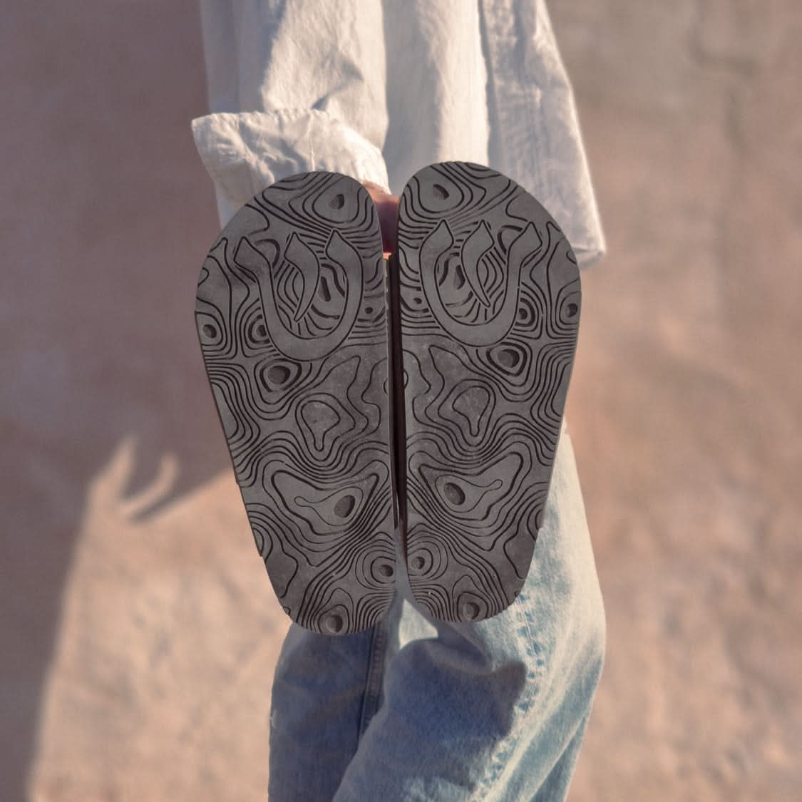 Every sandal has the topography of Jerusalem on the bottom with the Hebrew letter Shin.