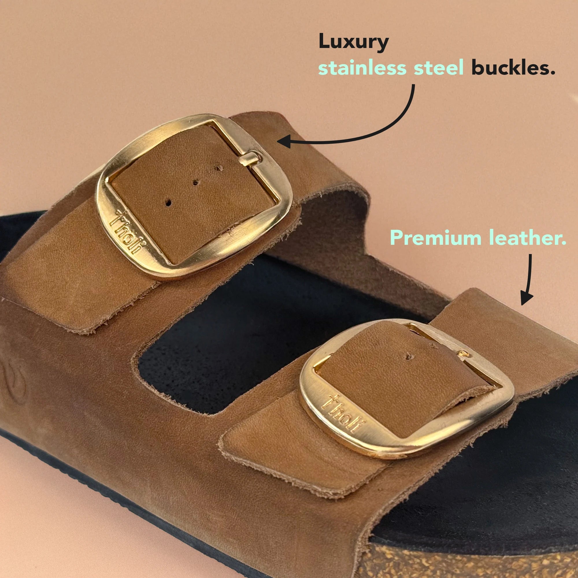Wrap your foot in our premium leather straps and secure with luxury stainless steel buckles.